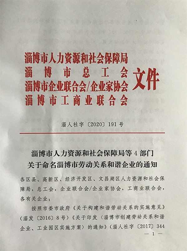 日前,公司順利通過(guò)淄博市人力資源和社會(huì)保障局、淄博市總工會(huì)、淄博市企業(yè)聯(lián)合會(huì)/企業(yè)家協(xié)會(huì)、淄博市工商業(yè)聯(lián)合會(huì)等4部門關(guān)于開展淄博市和諧勞動(dòng)關(guān)系考核測(cè)評(píng),被評(píng)為淄博市模范勞動(dòng)關(guān)系和諧企業(yè)。