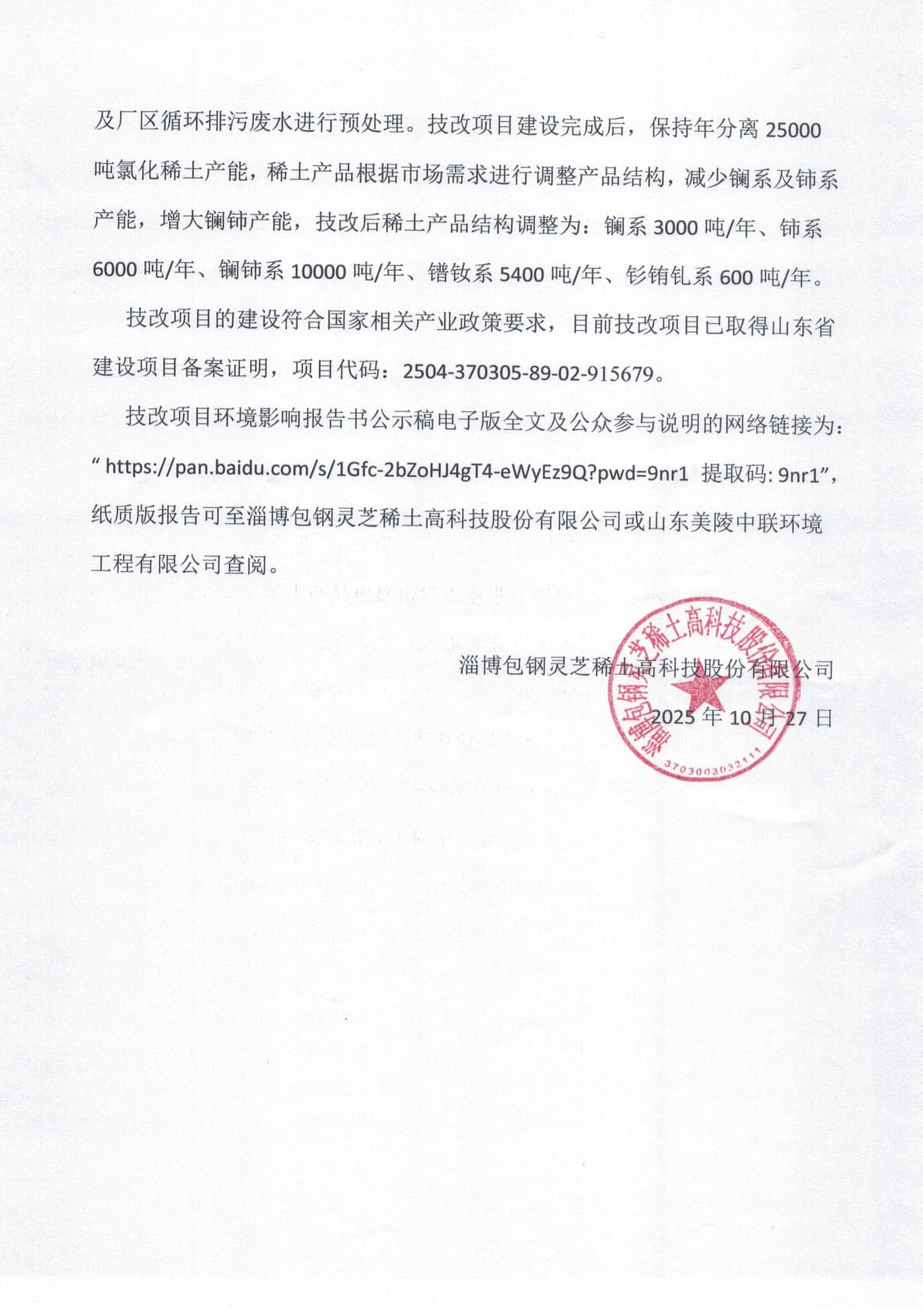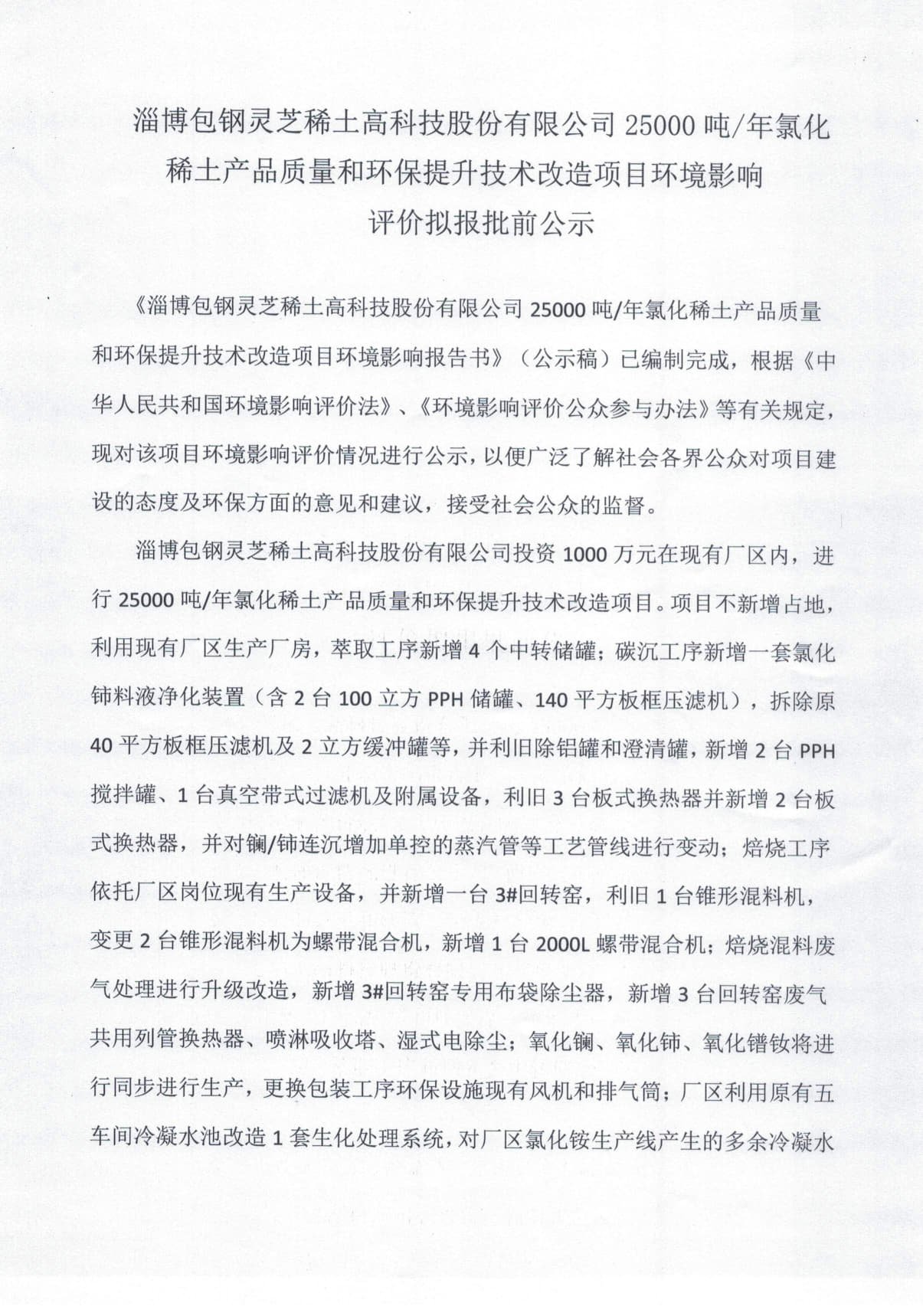 淄博包鋼靈芝稀土高科技股份有限公司25000噸/年氯化稀土產(chǎn)品質(zhì)量和環(huán)保提升技術(shù)改造項(xiàng)目環(huán)境影響評(píng)價(jià)擬報(bào)批前公示